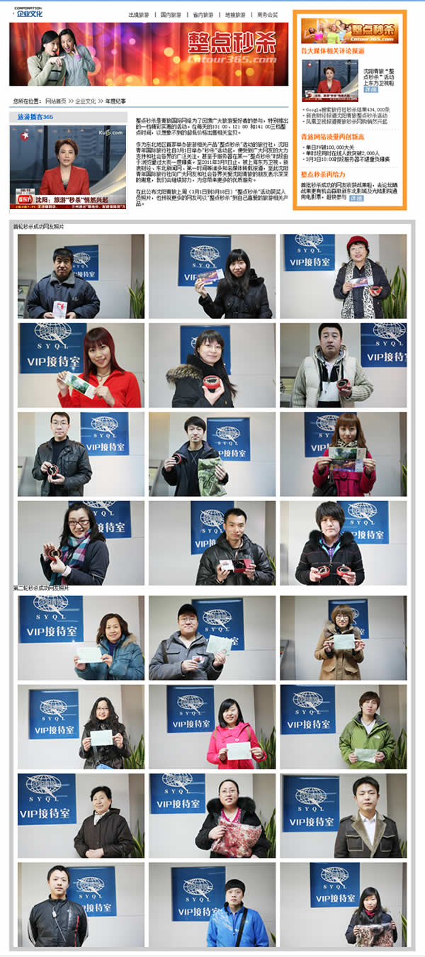 作為東北地區首家舉辦旅游相關產品“整點秒殺”活動的旅行社,沈陽青年國際旅行社自3月1日舉辦“秒殺”活動起,便受到廣大網友的大力支持和社會各界的廣泛關注,甚至于服務器在某一'整點秒殺'時段由于瀏覽量過大而一度癱瘓。至2011年3月7日止,被上海東方衛視、新浪財經、東北新聞網、第一時間等諸多知名媒體轉載報道,至此沈陽青年國際旅行社向廣大網友和社會各界關愛沈陽青旅的朋友表示深深的謝意,我們會繼續努力,為您帶來更多的優質服務。