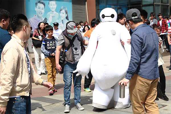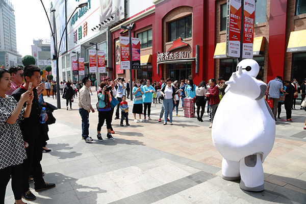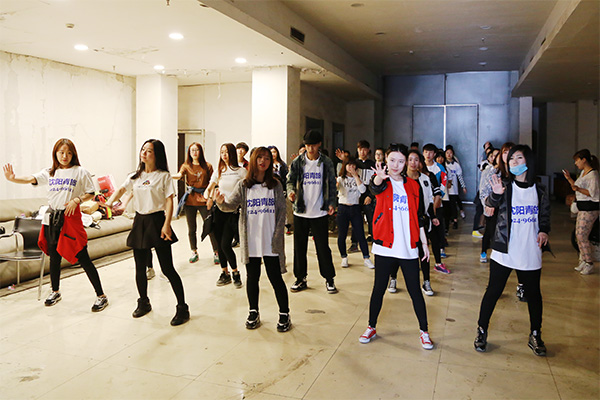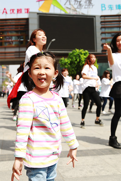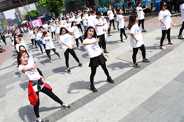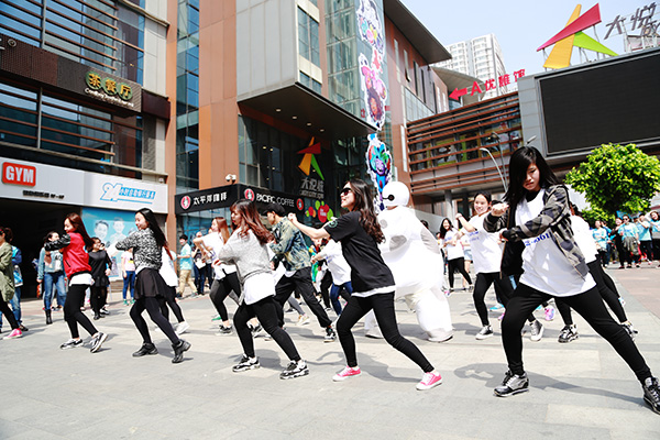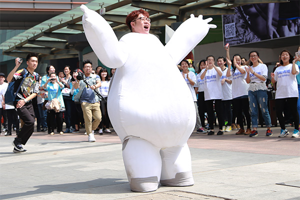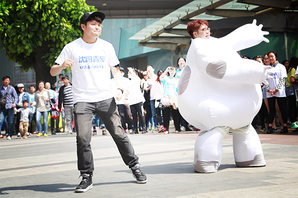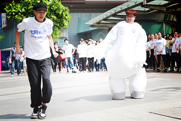 26日下午13:00,沈陽中街大悅城門前廣場像每個周末一樣人頭攢動,人們想平日一樣行走在周末擁擠的街頭。忽然,數十名年輕人從四面八方聚集至此,他們紛紛脫下自己的外套,方才還紛亂的街頭瞬間形成了一個整齊的方陣,同時還有一個可愛的“大白”人偶在方陣中間動感的跳舞,格外惹眼。這時候,人群中想起了音樂,原來是主持人大兵的新神曲《撓撓》,伴著勁爆的音樂,參與快閃的舞蹈演員們精彩的表演著節目,現場所有行人都不免駐足觀看。這時,大白將頭套摘掉,人群中爆發出了一陣尖叫——原來一直在人群中走動的“大白”竟然是著名主持人大兵。