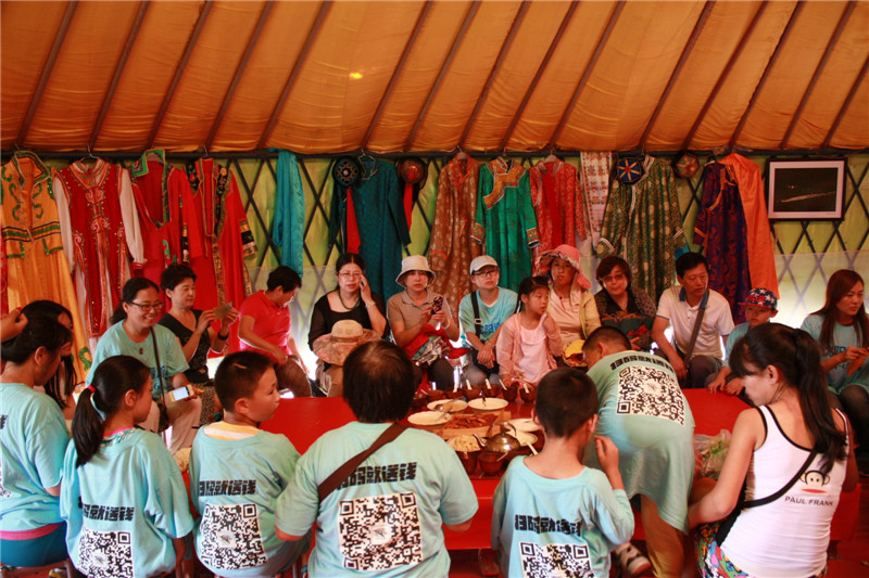 走進科爾沁草原、欣賞過靜謐的草原夜色后,迎來了看草原日出、體驗游牧民族生活、展優秀才藝等活動。大家還一起體驗牧民的生活,并感受他們的濃濃熱情款待。觀看老藝人馬頭琴表演、聽蒙古人歌曲、品牧民的待客奶茶、炒米、奶酪、酸奶等活動讓大家對蒙古文化更加熱愛。熱情好客的蒙古族朋友們還教大家學習蒙語送問候,一同祭祀敖包、參與草原那達幕盛會觀看了賽馬表演、摔跤表演等節目。在草原沒有一絲塵埃的星空下,大家帶著愉悅的心情赴通遼舉行了開營文藝演出活動。專業老師悉心指導,大家總結一日心得后入住酒店。