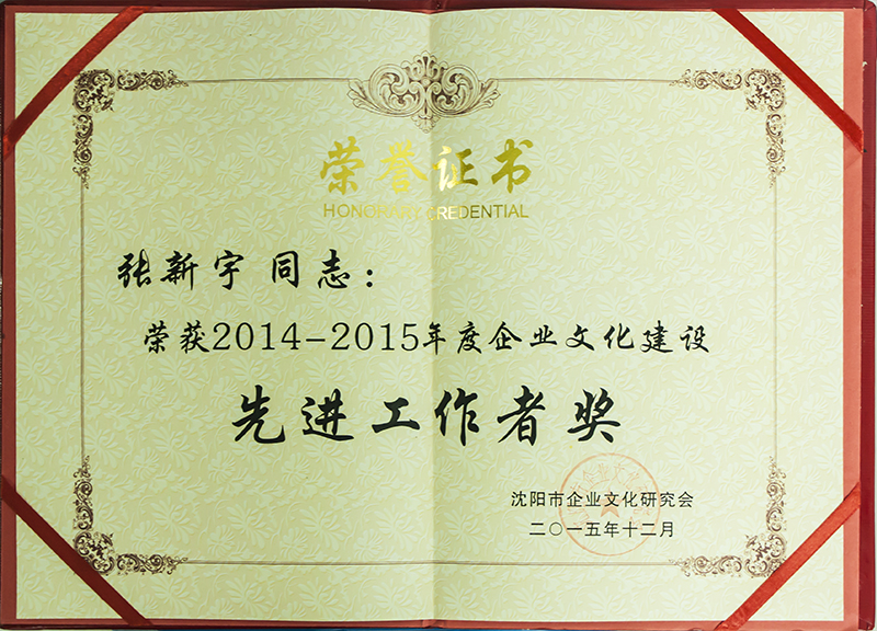 2015年12月15日,沈陽(yáng)市企業(yè)文化研究會(huì)授予我社2014-2015年度企業(yè)文化建設(shè)優(yōu)秀單位獎(jiǎng),同時(shí)為我社張新宇總經(jīng)理頒發(fā)2014-2015年度企業(yè)文化建設(shè)先進(jìn)工作者獎(jiǎng)!