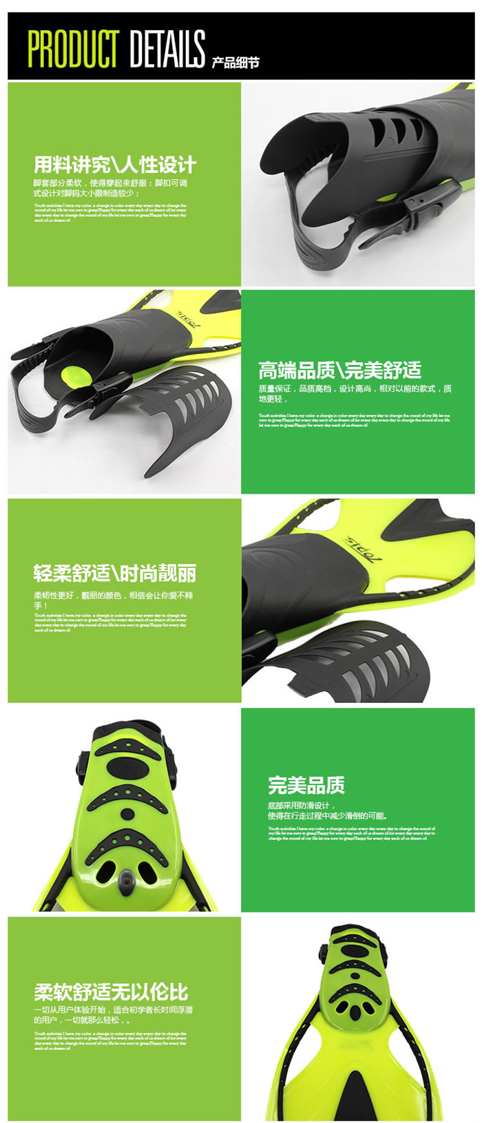 【介紹】:最新推出的熱門可調(diào)式浮潛游泳腳蹼,全新視覺,輕便快速設(shè)計(jì),物美價(jià)廉。多吼及流線設(shè)計(jì),使用排水性好,在增強(qiáng)推力的同時(shí)更加省力,輕松自如;腳套部分柔軟,使得穿起來舒服;腳扣可調(diào)式設(shè)計(jì)對腳碼大小限制造較少;底部采用防滑設(shè)計(jì),使得在行走過程中減少滑倒的可能。全外資企業(yè)出品產(chǎn)品,質(zhì)量保證,品質(zhì)高檔,設(shè)計(jì)高尚,相對以前的款式,質(zhì)地更輕,柔韌性更好,靚麗的顏色,相信會(huì)讓你愛不釋手!